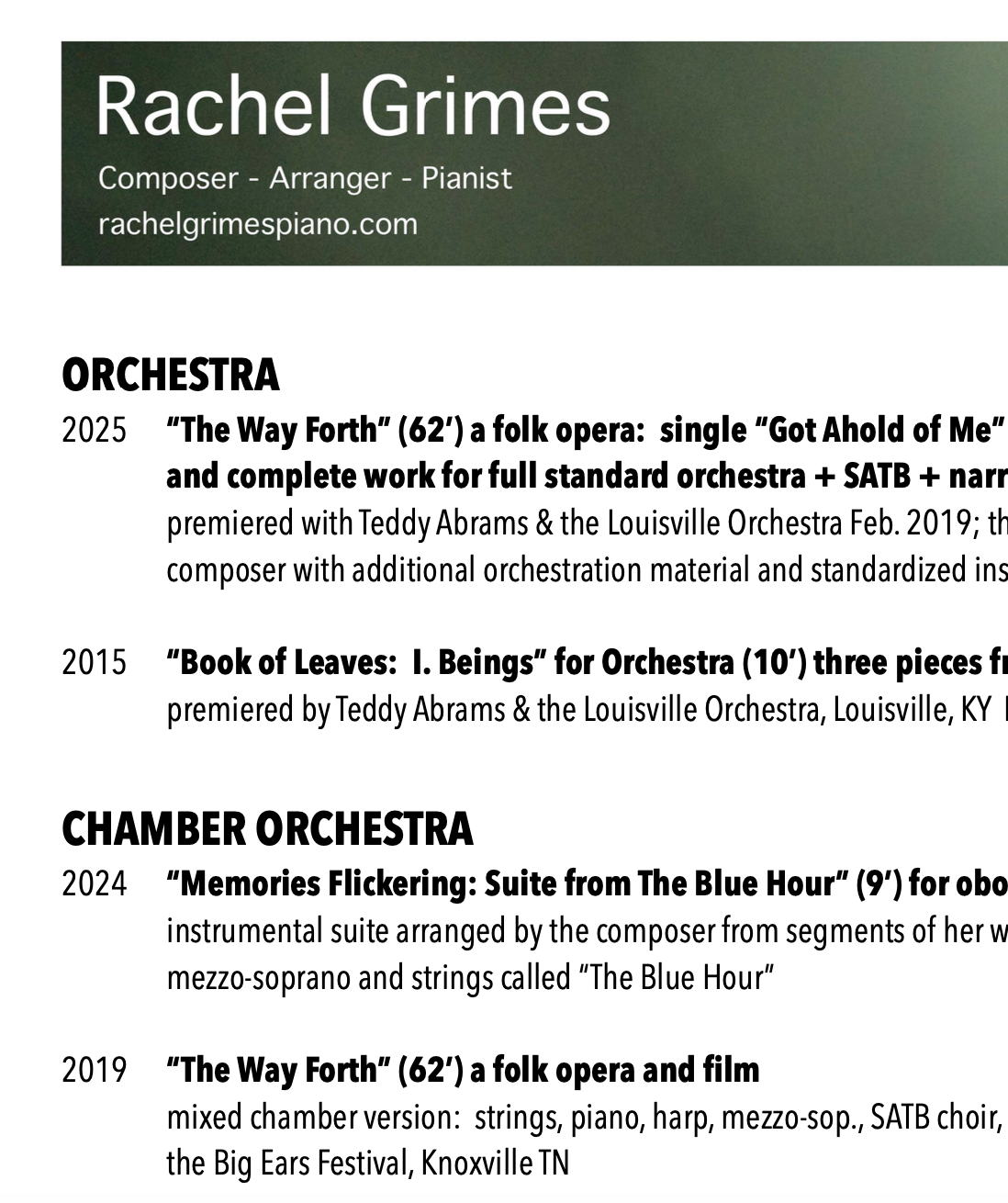 A – WORKS: Rachel Grimes – PDF $0.00 Complete works PDF 2025 A - WORKS: Rachel Grimes - PDF quantity Add to cart Categories: Chamber ensemble, Orchestra, Piano, Rachel's, SATB, Sheet Music Related products Music for Egon Schiele: Wally, Egon & Models in the Studio (C Transcription): for Cello + Piano – PDF Score + Parts $15.00 Add to cart May the Night: for SATB A Cappella Choir – PDF $10.00 Add to cart Music For Egon Schiele: A Suite for Violin, Cello + Piano – PDF Score + Parts $40.00 Add to cart Esperanza: for Clarinet, Horn + Strings – PDF Score + Parts $25.00 Add to cart